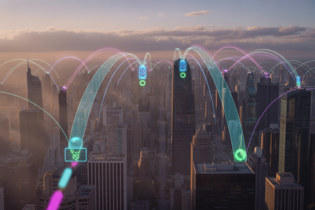 • Style: Urban-futuristic, vibrant, with layered cityscapes and data flows.